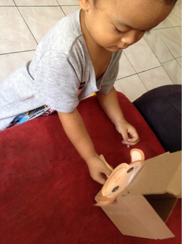 Raffi kebetulan saat ini lebih suka mainan kardus yang lebih besar. Urban mama bisa juga membuat beberapa hewan sekaligus dengan kardus yang lebih besar, anak-anak nanti bisa 'memberi makan' banyak hewan sekaligus. Tertarik membuatnya, urban mama? Selamat mencoba!