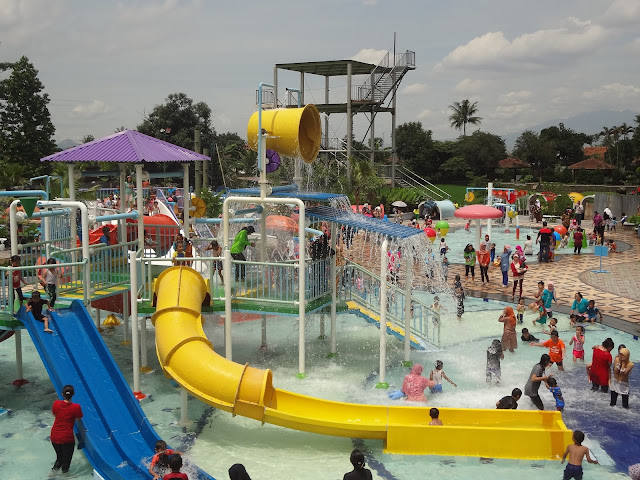 Baru makan sedikit, Anipchan sudah merengek minta jalan-jalan ke ujung area makan. Ada apa di sana? Ternyata tepat di belakang area makan ada waterpark yang cukup besar! Namanya Tekno Waterpark. Seperti waterpark lain, di sini juga ada air tumpah, waterboom, kolam air hangat dan kayanya masih akan dibangun kolam arus dan beberapa kolam lain di sisinya.